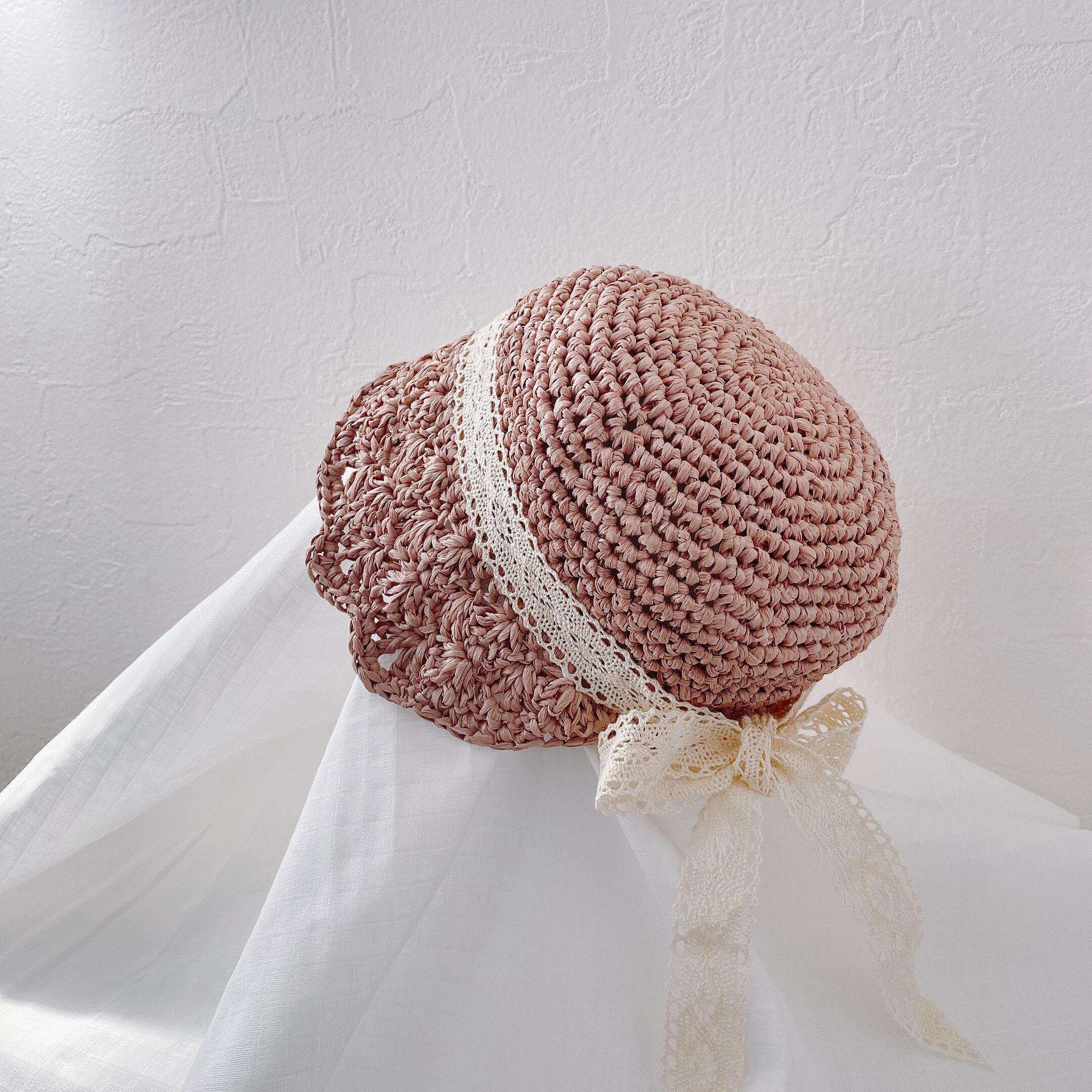 リボンを編み目に通せば顎下で結ぶ事も出来ます