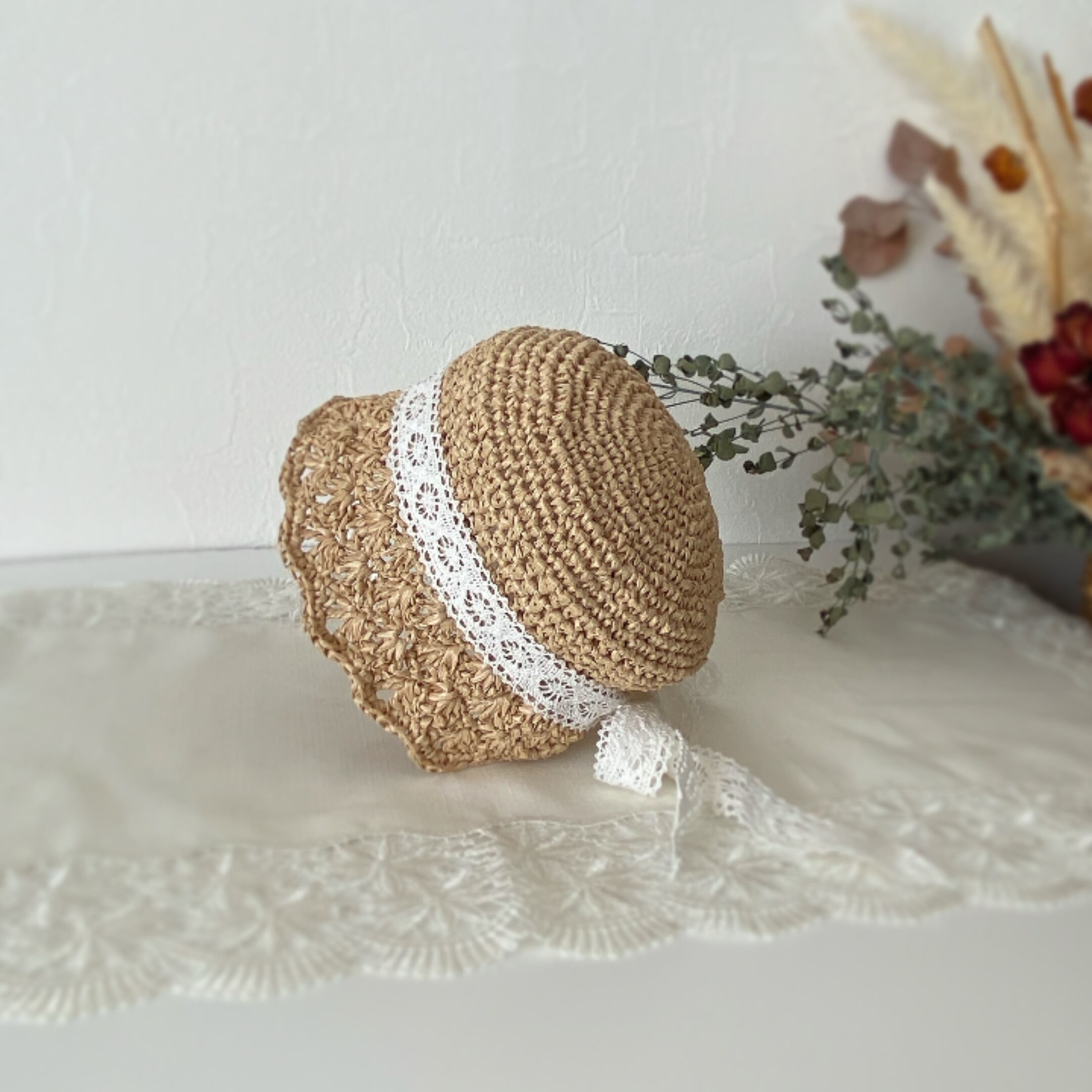 リボンを編み目に通せば顎下で結ぶ事も出来ます